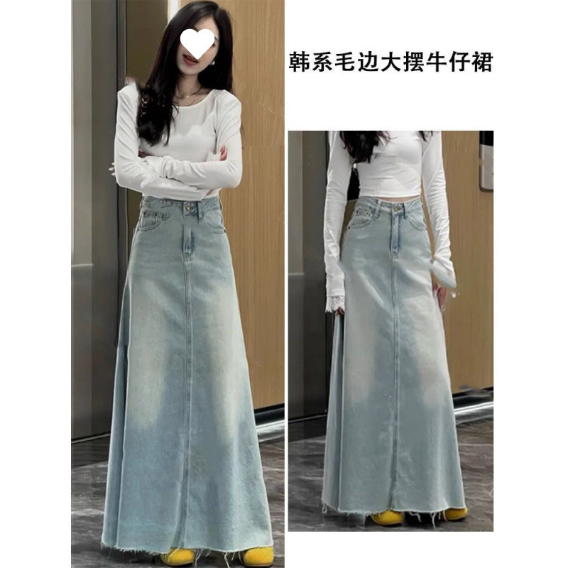 Rok Setengah Badan Denim Besar Pinggiran Wol Gaya Korea Rok A-Line Gaya Senior Terlihat Langsing Longgar Wanita Ukuran Besar Ukuran Besar Model Baru Musim Gugur Wanita