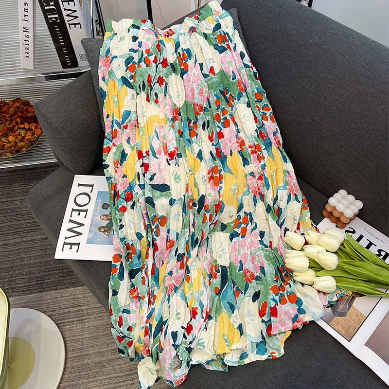 Liangyixuan rok midi wanita, Bawahan bunga longgar pinggang tinggi warna kuning matahari artistik untuk perempuan