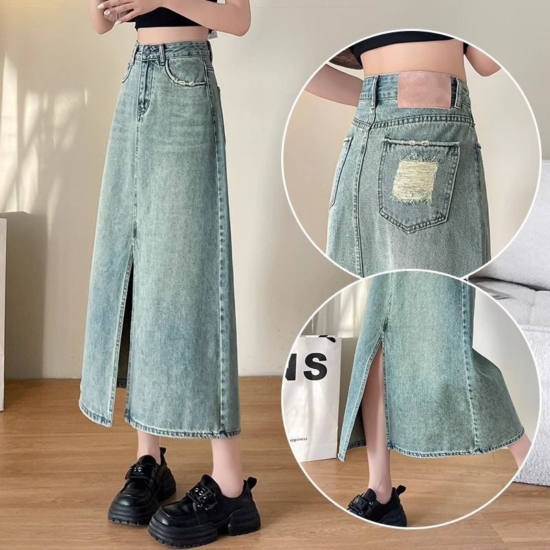 Rok elastis baru musim semi 2024 pakaian wanita ukuran besar rok seksi split denim buatan 8570