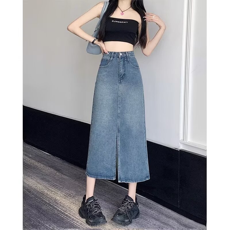 Rok Ukuran Besar Model Populer Tahun Ini Rok Setengah Badan Rok Denim Panjang Sedang Membungkus Pinggul Pinggang Tinggi Model Baru 2025 Musim Panas