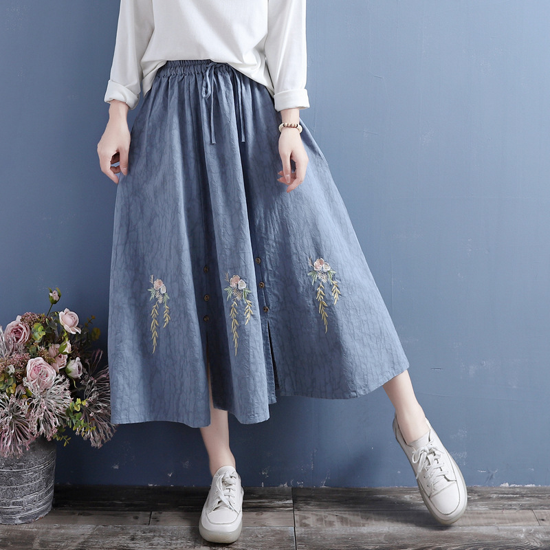 Rok pinggang wanita, gesper kayu linen katun, musim gugur 2024, rok pinggang serut bordir, gaya China, rok longgar artistik retro