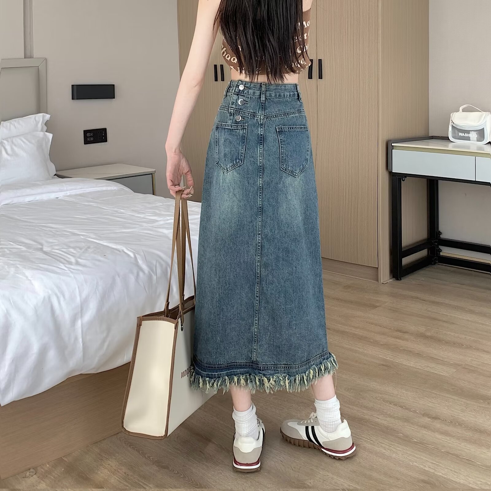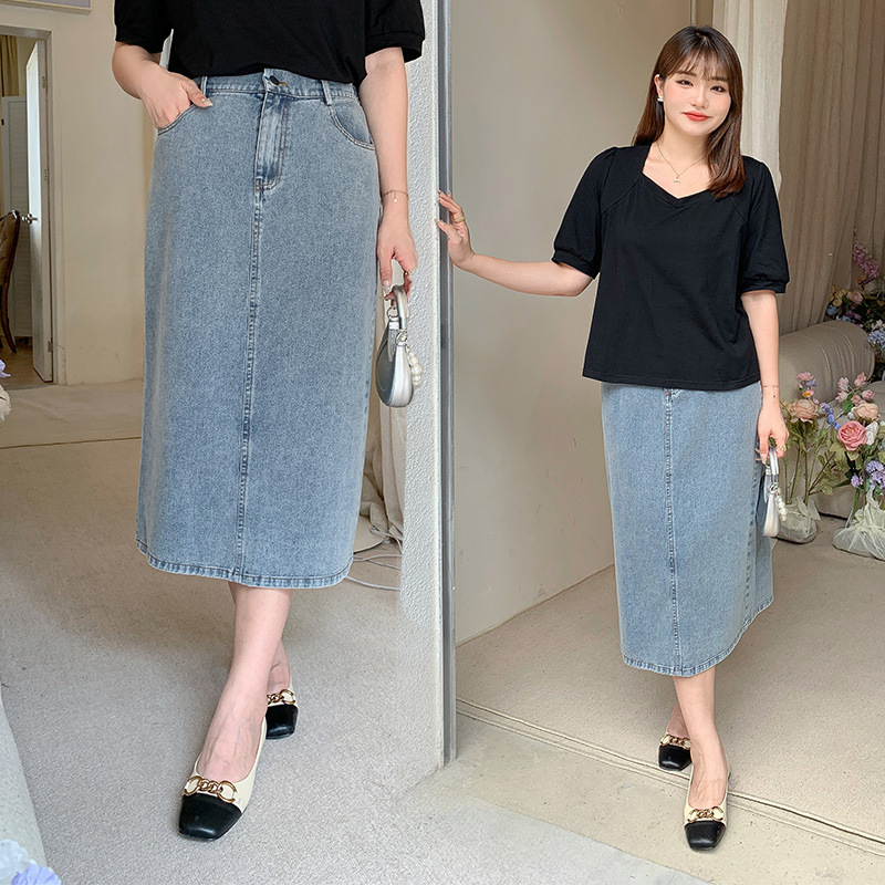 Rok Denim split Retro wanita, Rok midi ketat ukuran plus, pelangsing pinggang tinggi a-line Musim Semi dan Gugur 2024