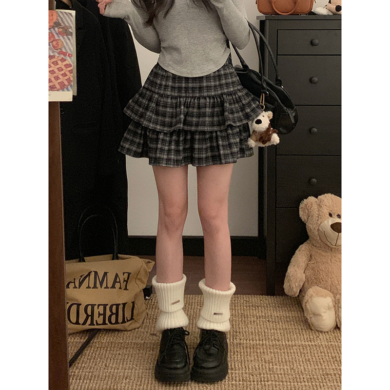 Pakaian Wanita Ukuran Besar Rok Setengah Badan Kotak-Kotak Garis Warna Kontras Rok Kue Pinggiran Daun Teratai Model Baru Musim Semi Rok Pendek Gadis
