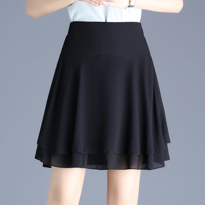 Rok sifon ukuran besar, rok sifon baru musim panas pinggang elastis hitam lapisan ganda pinggang tinggi model A- line