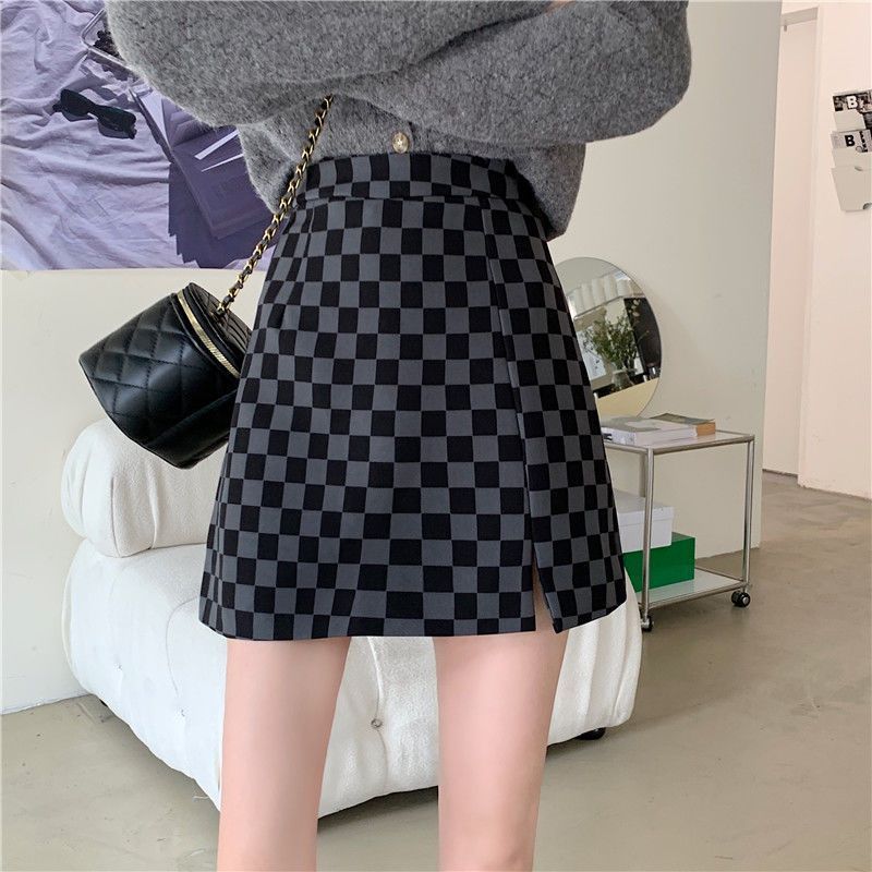棋盘格子西装半身裙女夏季高腰显瘦气质辣妹仿走光a字包臀短裙ins