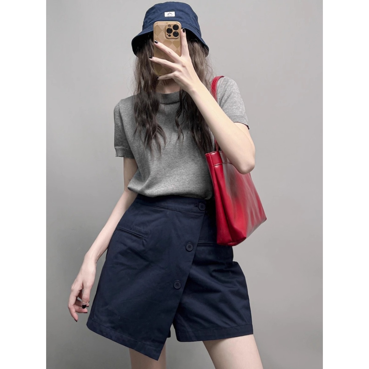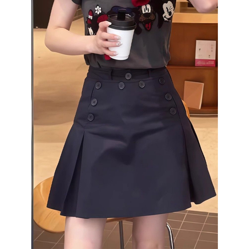 Rok Pendek Setengah Badan Pinggang Tinggi Kancing Wanita Musim Panas dan Musim Gugur Ukuran Besar Wanita Gemuk Rok A-Line Menutupi Daging Mudah Dipadu Padan Warna Biru Tua
