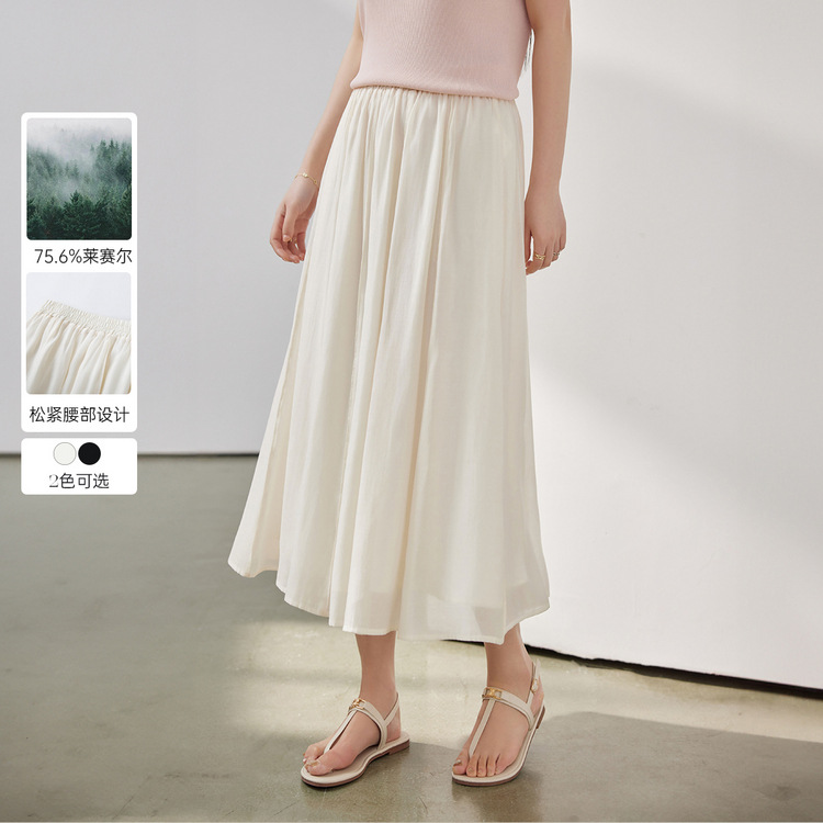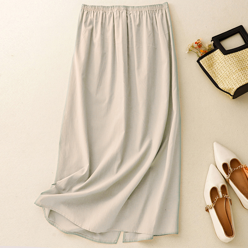 Foto Solid Pakaian Wanita Ukuran Besar Longgar Model Baru Musim Panas 2025 Rok Setengah Badan Pinggang Elastis Sederhana Retro Seni Katun Linen