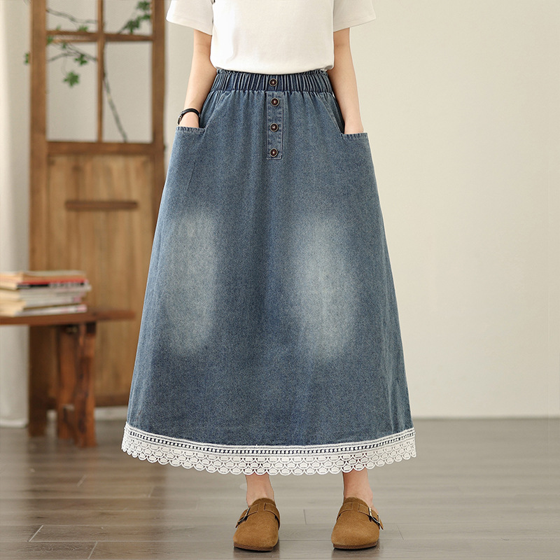 Rok Denim Pinggiran Renda Renda Jahitan Wanita Berukuran Besar Terlihat Kurus Longgar Ukuran Besar Model Baru Musim Panas 2025