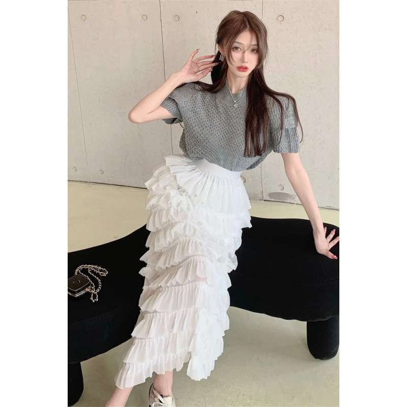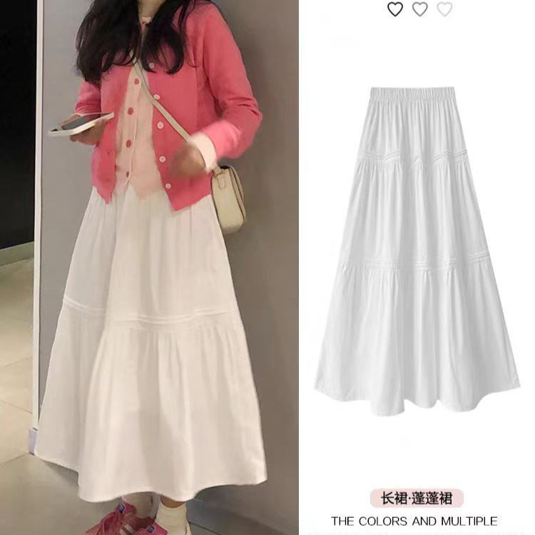 Rok Setengah Badan Warna Putih Rok Panjang Sedang A-Line Pinggang Tinggi Model Baru Musim Panas Wanita Rok Kue Berbulu Badan Terlihat Kurus