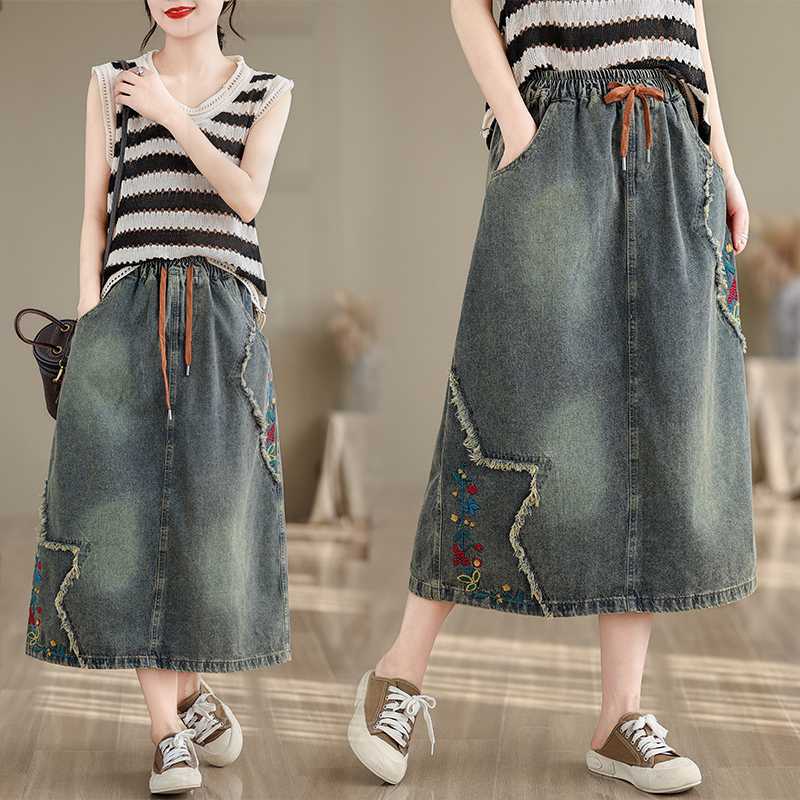 2024 Musim Panas artistik baru ukuran besar gaya etnik longgar Denim pinggang sedang rok a-line untuk wanita