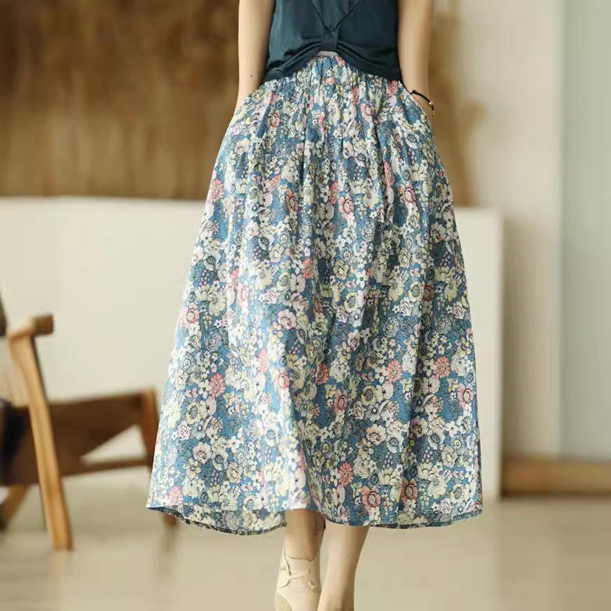 Rok katun linen baru musim panas rok motif bunga antik a-line 5734 longgar wanita setengah panjang
