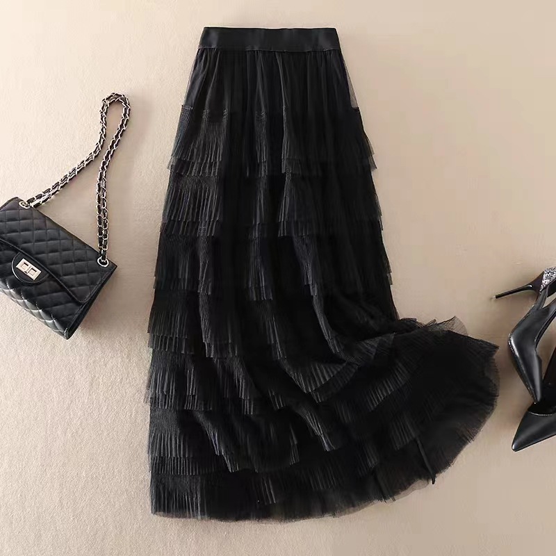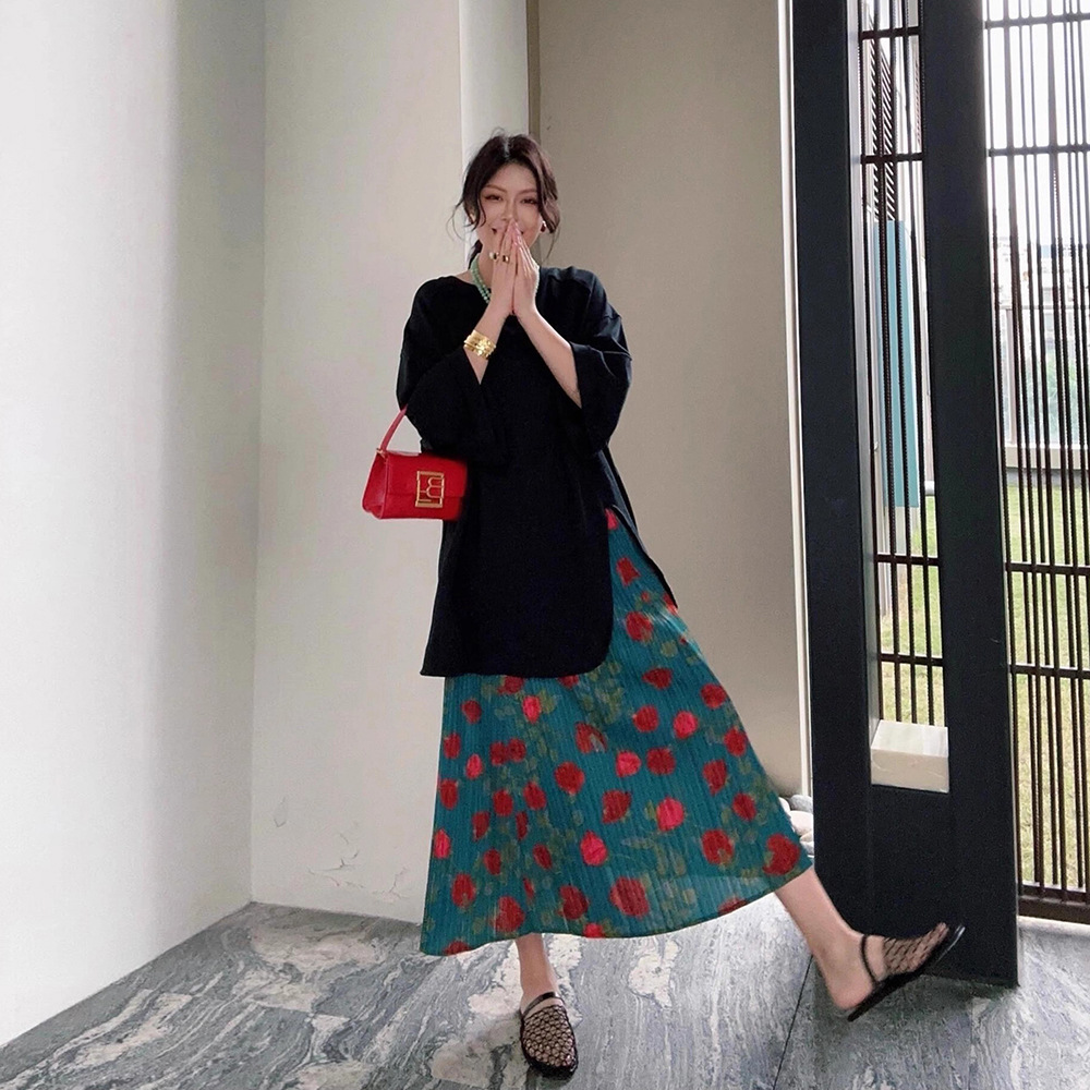 Rok Setengah Badan Warna Hitam Rok Lipit Model Setengah Panjang Wanita Musim Semi Musim Panas Pinggang Tinggi A-Line Terlihat Langsing 2023 Rok Panjang Bawah Lutut Model Baru Ukuran Besar