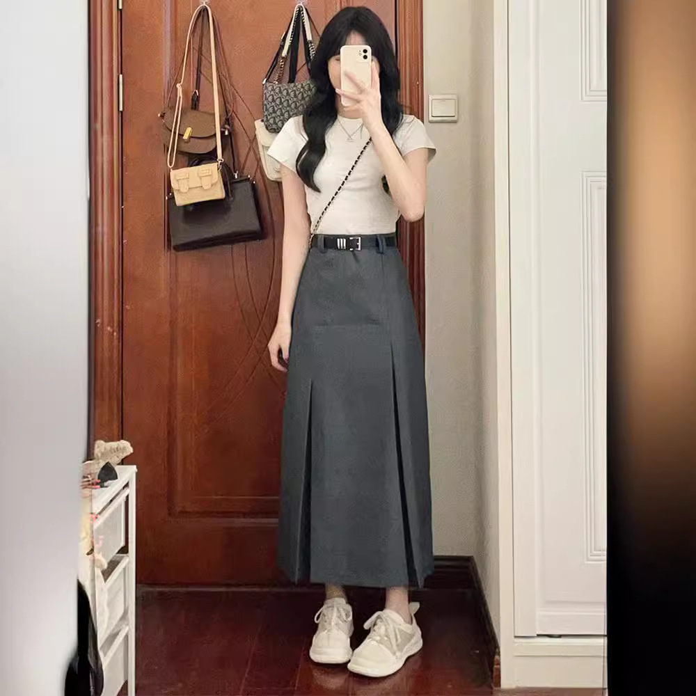 Rok Setengah Badan Pakaian Kerja Serut Ukuran Besar Musim Panas Rok Setengah Huruf A Rok Setengah Panjang Wanita Model Panjang Sedang Terlihat Langsing Menutupi Pinggang Tinggi