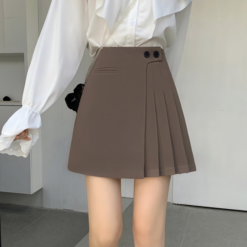 Rok Lipit Warna Kopi Ukuran Besar Rok Setengah Badan Wanita Model Baru Musim Gugur 2025 Rok Pendek Huruf A Gaya Sekolah Lipit Terlihat Langsing Pinggang Tinggi