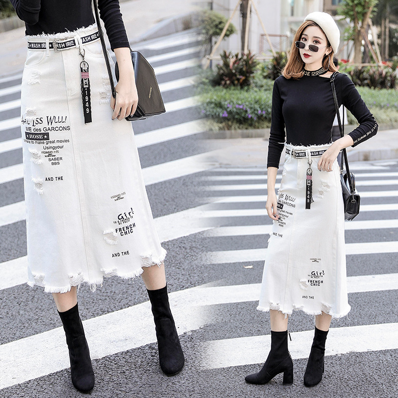 Rok denim stasiun Eropa untuk wanita, rok denim musim semi/musim panas ukuran plus, rok putih robek panjang setengah, Rok terusan berjumbai