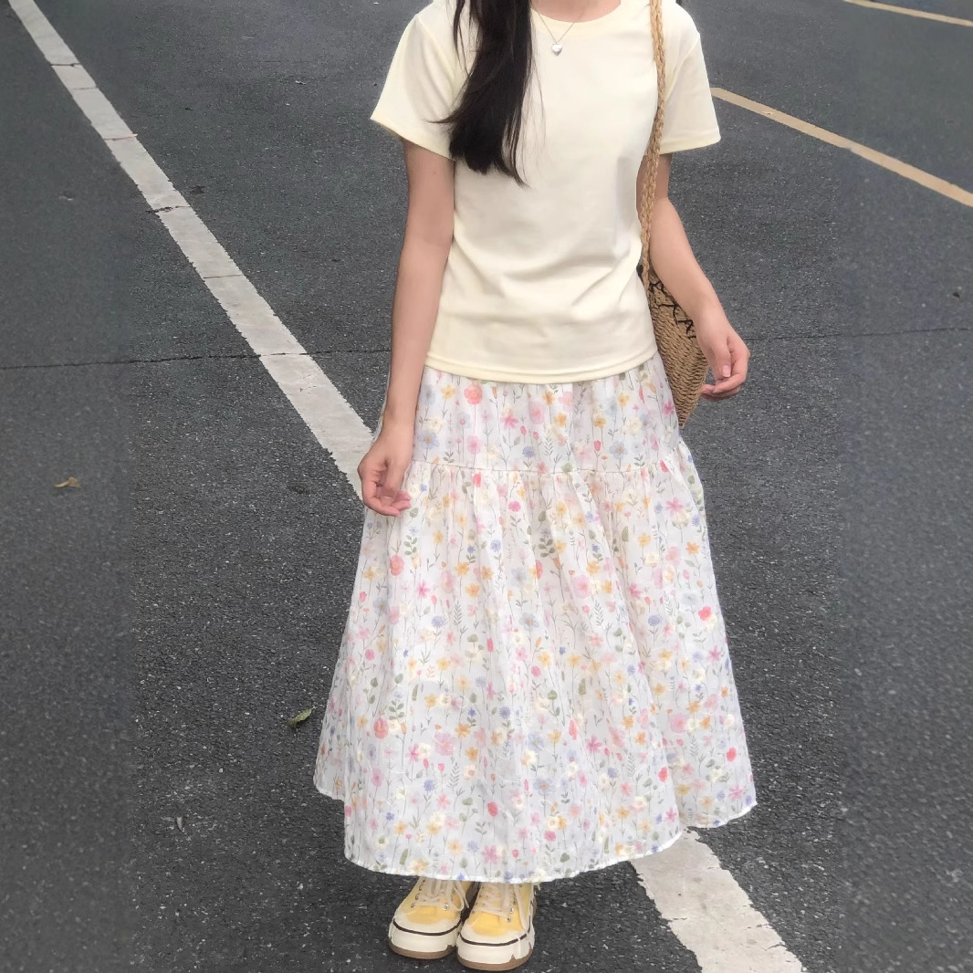 Rok Setengah Badan Rok Panjang Elegan Terlihat Langsing Elegan Segar Gaya Peri Super Peri Bunga Bunga A-Line Musim Panas 2024