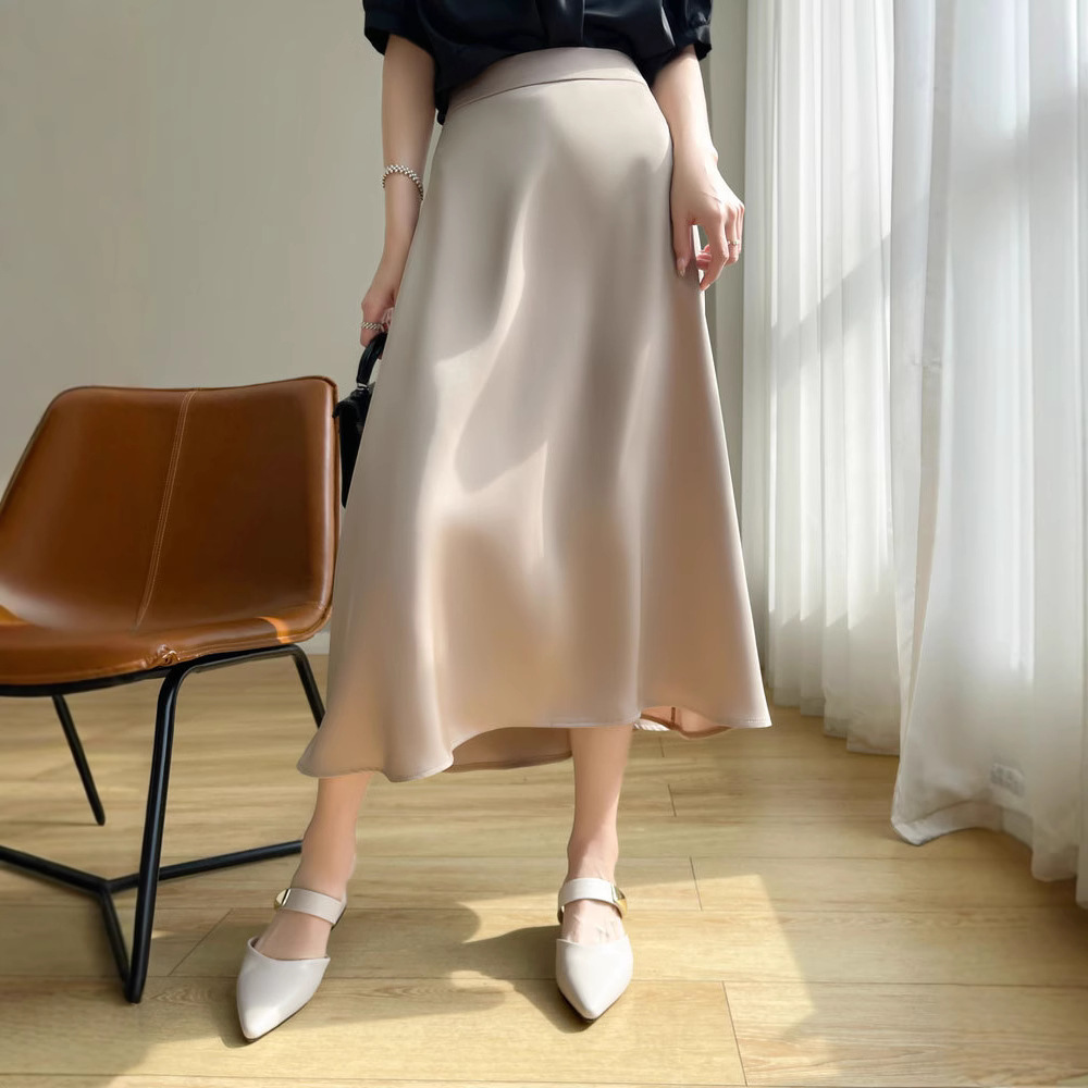 Rok wanita ukuran besar, Rok midi gaya Korea elegan Semua cocok pinggang tinggi warna solid menutupi daging musim panas
