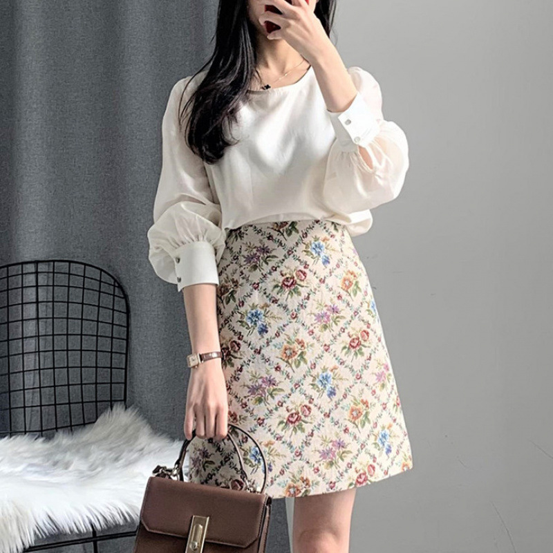 Rok Setengah Badan Pinggang Tinggi Warna Aprikot Rok Bungkus Pinggul Bunga Kotak-Kotak Model Baru Musim Semi 2025 Rok Pendek Wanita Terlihat Kurus Ukuran Besar