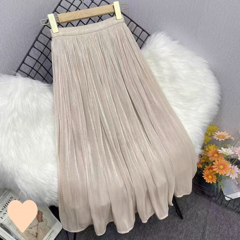 Rok Setengah Badan Wanita Halus Emas Mewah Ringan Musim Panas Model Baru Musim Panas Longgar Ukuran Besar Pinggang Tinggi Terlihat Kurus Berkaca Rok Besar