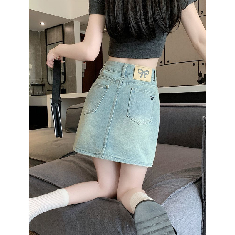 Gadis Pedas Rok Setengah Badan Denim Bordir Pita Kupu-Kupu yang Dicuci Air Rok Pendek Terlihat Kurus Menutupi Pinggul Berukuran Besar Pinggang Tinggi Musim Panas Wanita