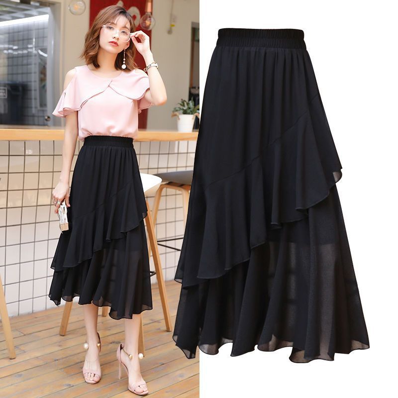 Pakaian wanita ukuran besar, rok sifon tipis setengah panjang elegan, rok a-line tidak beraturan, pakaian wanita gemuk, rok musim panas wanita ukuran Plus