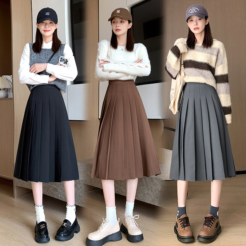 Rok lipit abu-abu untuk wanita, Rok lipit abu-abu musim semi musim gugur dan musim dingin, rok panjang setengah pinggang tinggi, rok a-line pelangsing ukuran plus untuk wanita 2023