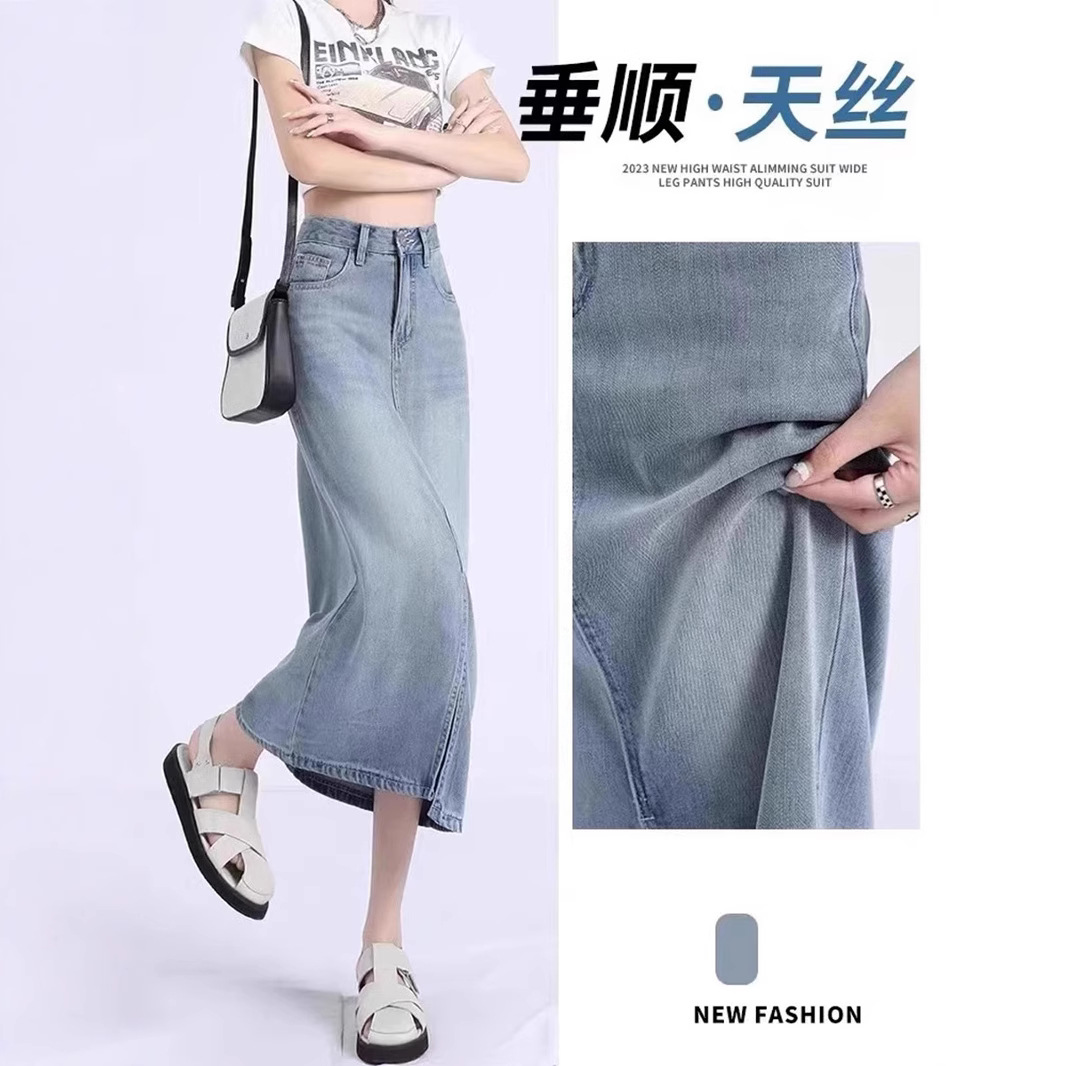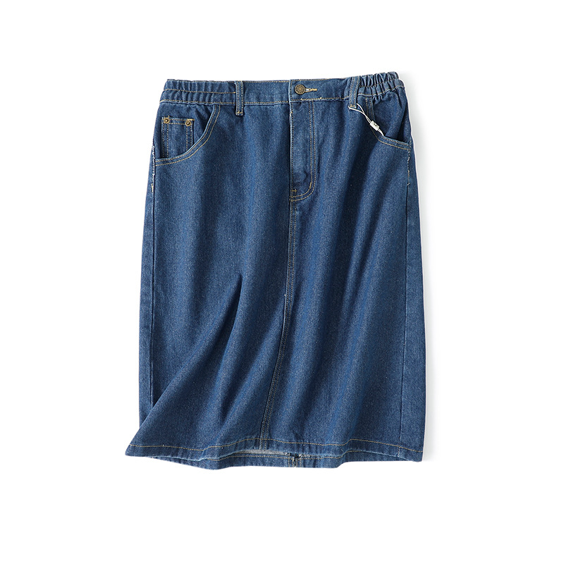 Rok denim pinggang tinggi wanita, rok Denim pinggang tinggi musim semi dan panas, rok panjang denim, rok pinggul ukuran plus, spandeks ramping