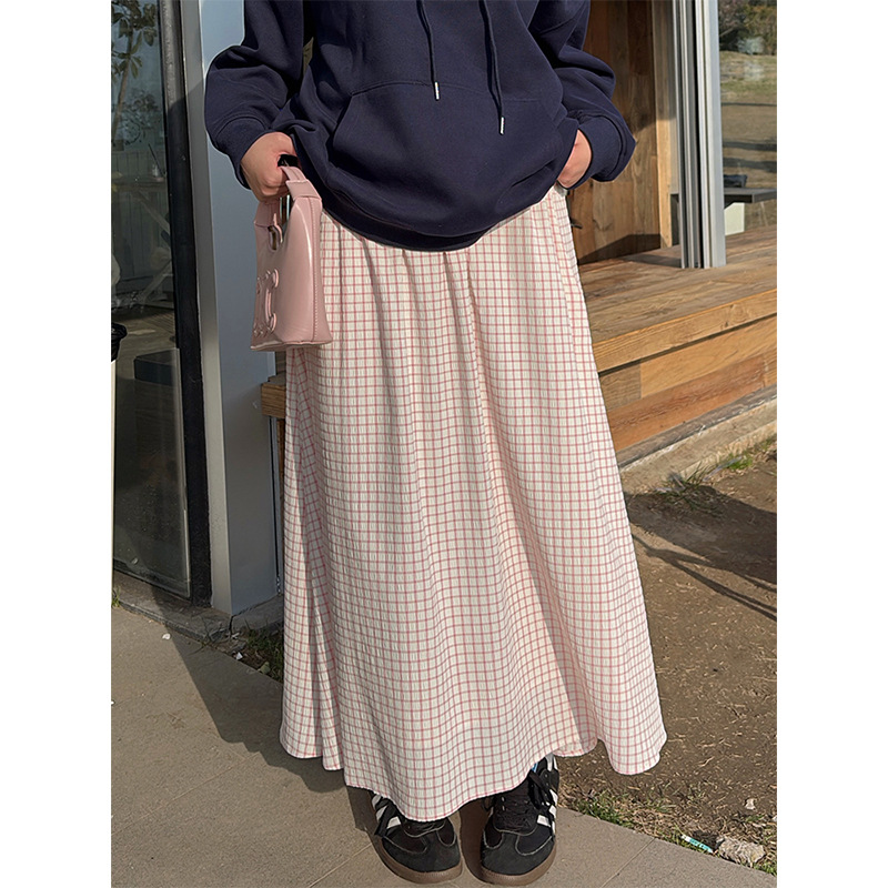 Pakaian Wanita Ukuran Besar Rok Setengah Badan Kotak-Kotak Merah Muda Gaya Korea Ketat Rok Panjang Artistik Terlihat Langsing Elegan Model Setengah Panjang Pinggang Tinggi Mudah Dipadu Padan