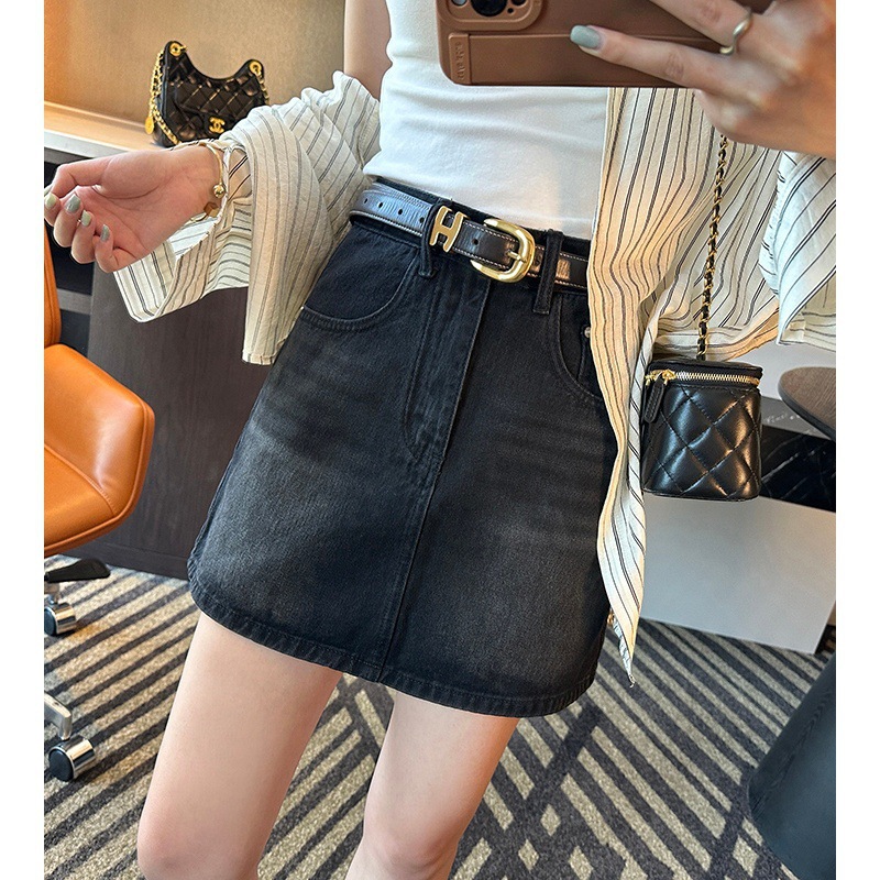 Rok Setengah Badan Denim Abu-abu Hitam Gaya Desain Ukuran Besar Rok Denim Terlihat Langsing Pinggang Tinggi Model Baru 2025 Rok Pendek Huruf A
