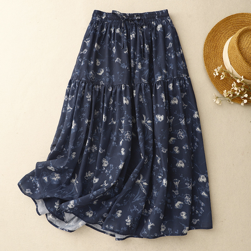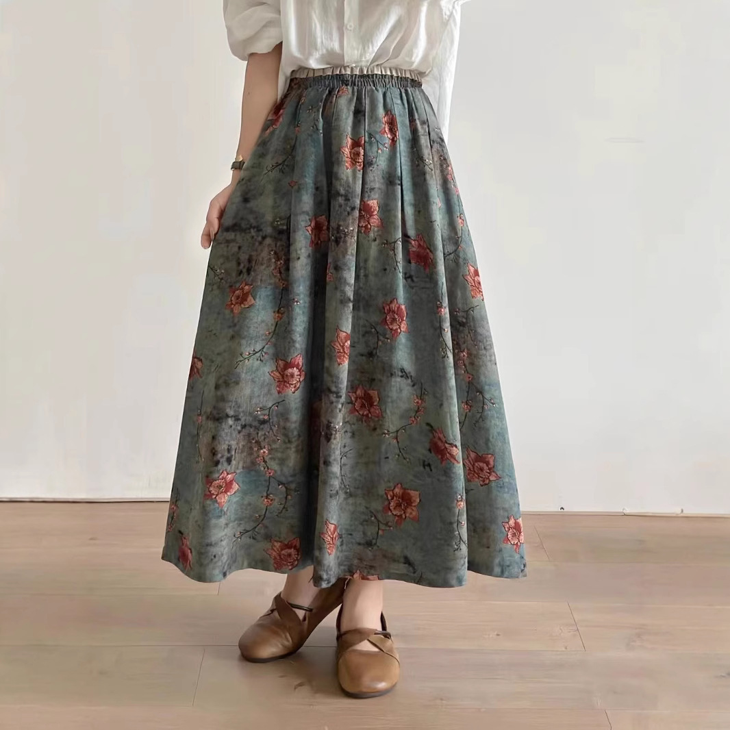 Rok Setengah Badan Cetak Katun Linen Model Baru Musim Panas Rok Setengah Panjang Ukuran Besar Retro Seni Pinggang Elastis 52088