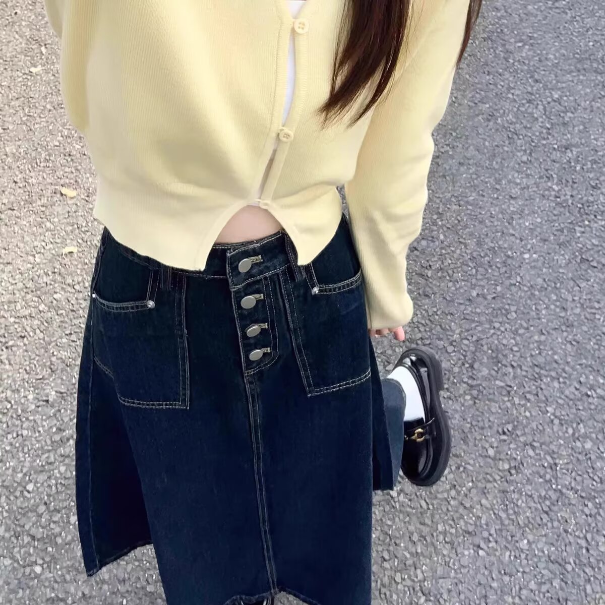 Rok Setengah Badan Denim Dicuci Air Retro Ukuran Besar Wanita Rok Membungkus Pinggul A-Line Terlihat Langsing Pinggang Tinggi Model Baru 2025 Wanita Rok Panjang Sedang