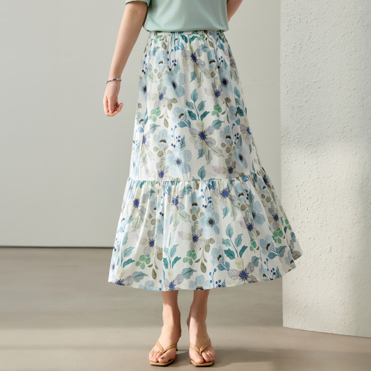 Foto asli Musim Panas 2025 Gaya Baru Pinggang Elastis Gaya Pedesaan Bercorak Mengurangi Usia Netral Rok Setengah Badan Wanita