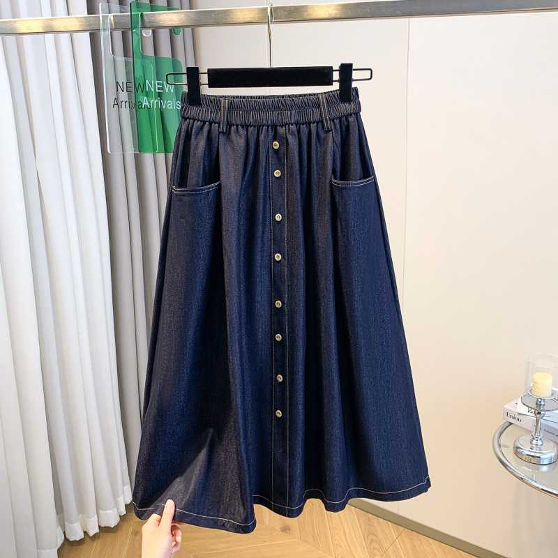 Rok Setengah Badan Netral Menutupi Pinggang Terlihat Langsing Ukuran Besar Model Baru Musim Semi dan Musim Panas 2025 Rok Denim A-Line Wanita Pinggang Elastis