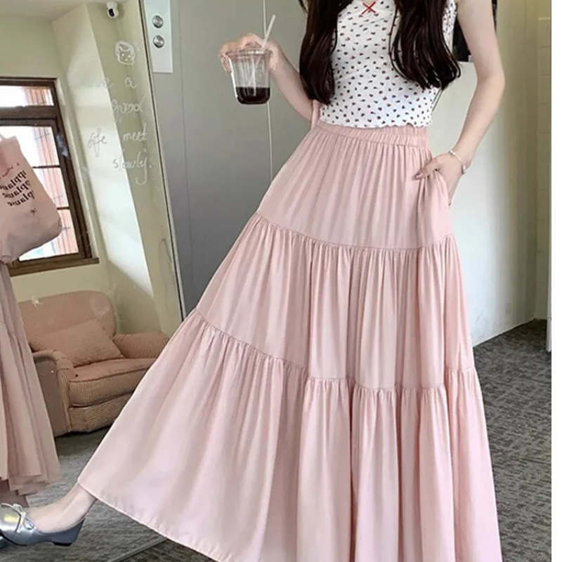 Rok Setengah Badan Sutra Es Gaya Lembut Rok Kue Putri Peri A-Line Pinggang Tinggi Ukuran Besar Musim Panas