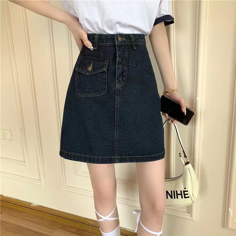 Rok Setengah Badan Denim Retro Ukuran Besar Pinggang Tinggi Rok Pendek A-Line Menutupi Pinggul Terlihat Langsing Bentuk Tubuh Pir Gadis Gemuk Musim Panas Wanita