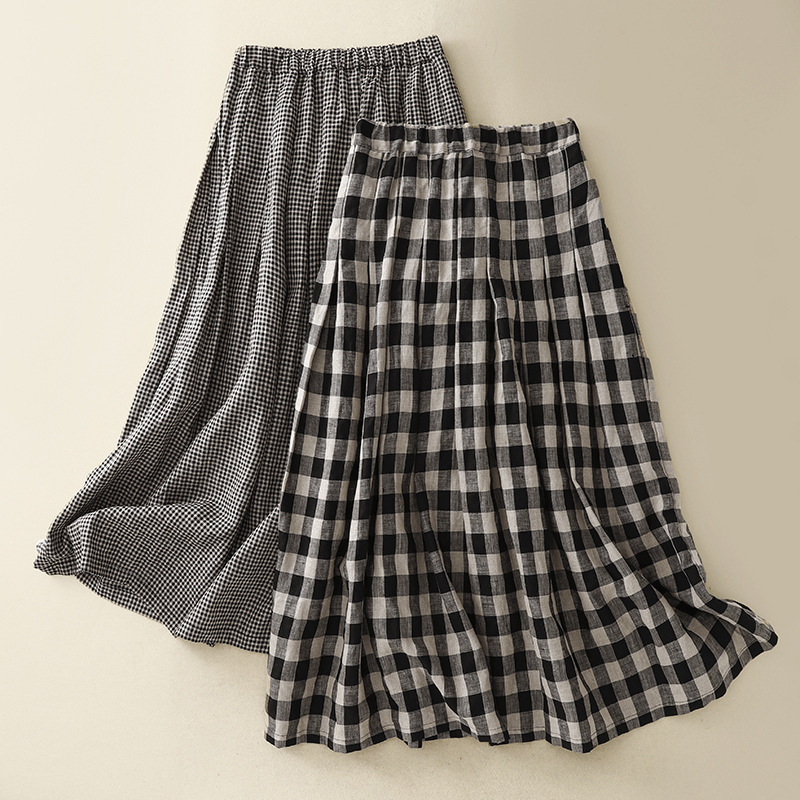 Rok Setengah Badan Wanita Di Bawah Lutut Kotak-Kotak Mudah Dipadu Padan Klasik Modis Pinggang Elastis Manis Sastra Jepang Model Baru Musim Panas
