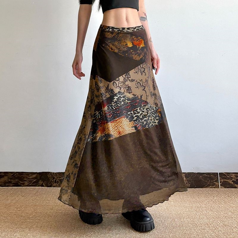 Pakaian Wanita Ukuran Besar 300Kg Rok Setengah Benang Retro Warna Coklat Rok Panjang Sedang Ramping Desain Kombinasi Motif Cetak Vintage