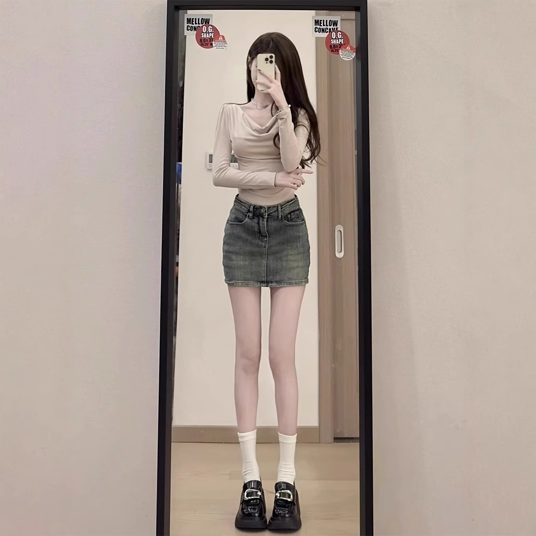 Rok Setengah Badan Denim Pinggang Tinggi Pakaian Kerja Amerika Rok Pendek Menutupi Pinggul Terlihat Kurus Mudah Dipadu Padan Wanita Gemuk Ukuran Besar Musim Panas Musim Semi