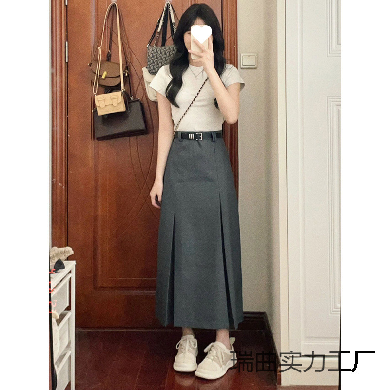 Rok Setengah Badan Setelan Abu-abu Rok Huruf A Lipit Pinggang Tinggi Bentuk Buah Pir Menutupi Perut Terlihat Langsing Longgar Ukuran Besar Wanita Gemuk Ukuran Besar Musim Panas