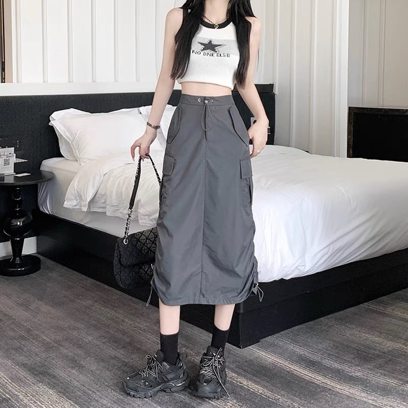 Rok Pakaian Kerja Retro Warna Abu-abu Gaya Amerika Ukuran Besar Rok Setengah Badan Model Setengah Panjang Model Belahan Musim Panas Wanita Rok Panjang Tali Serut