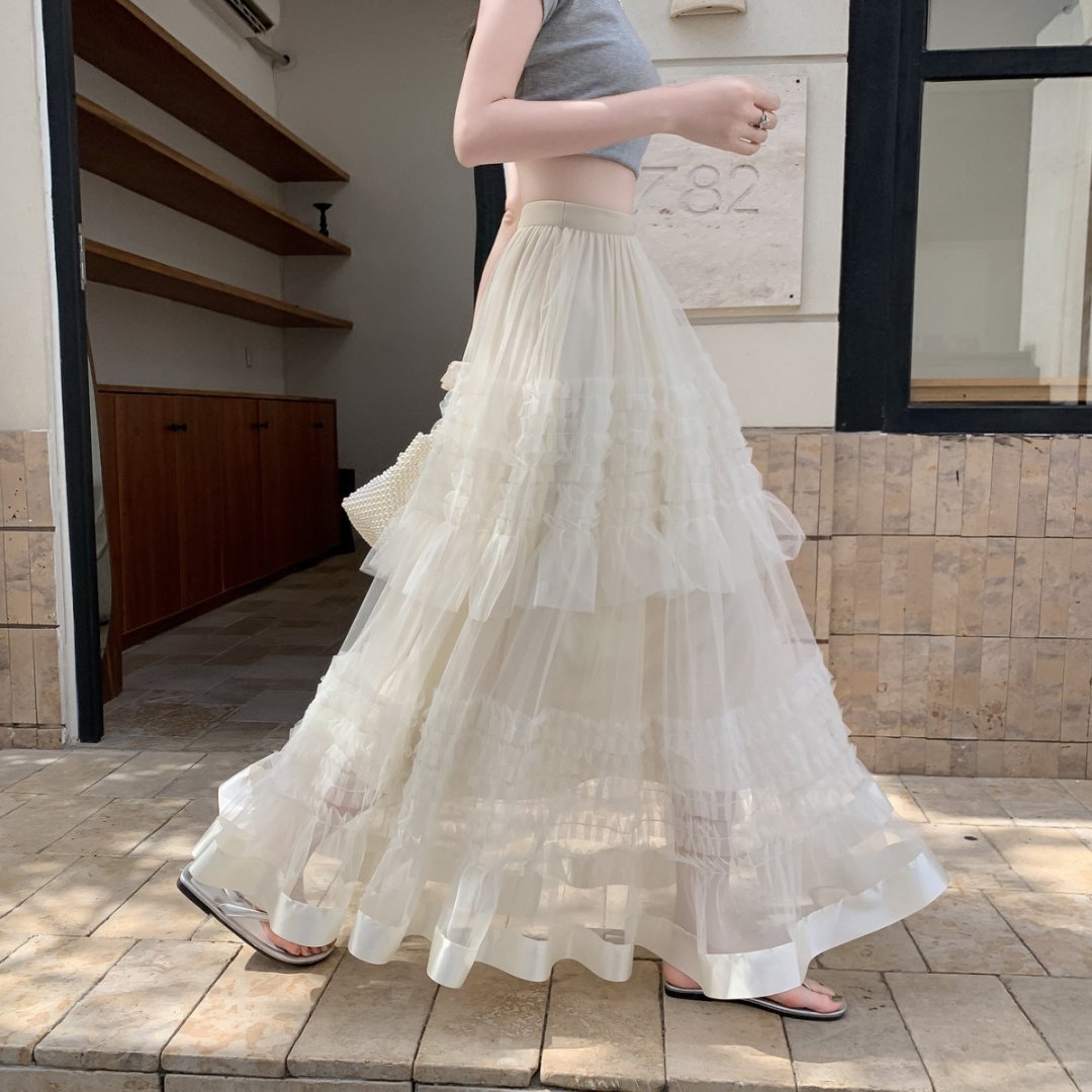 Rok Kasa Jaring Versi Korea Rok Setengah Badan Kue Rok Panjang A-Line Menutupi Pinggang Tinggi Model Baru Musim Semi dan Musim Panas 2025 Rok Benang