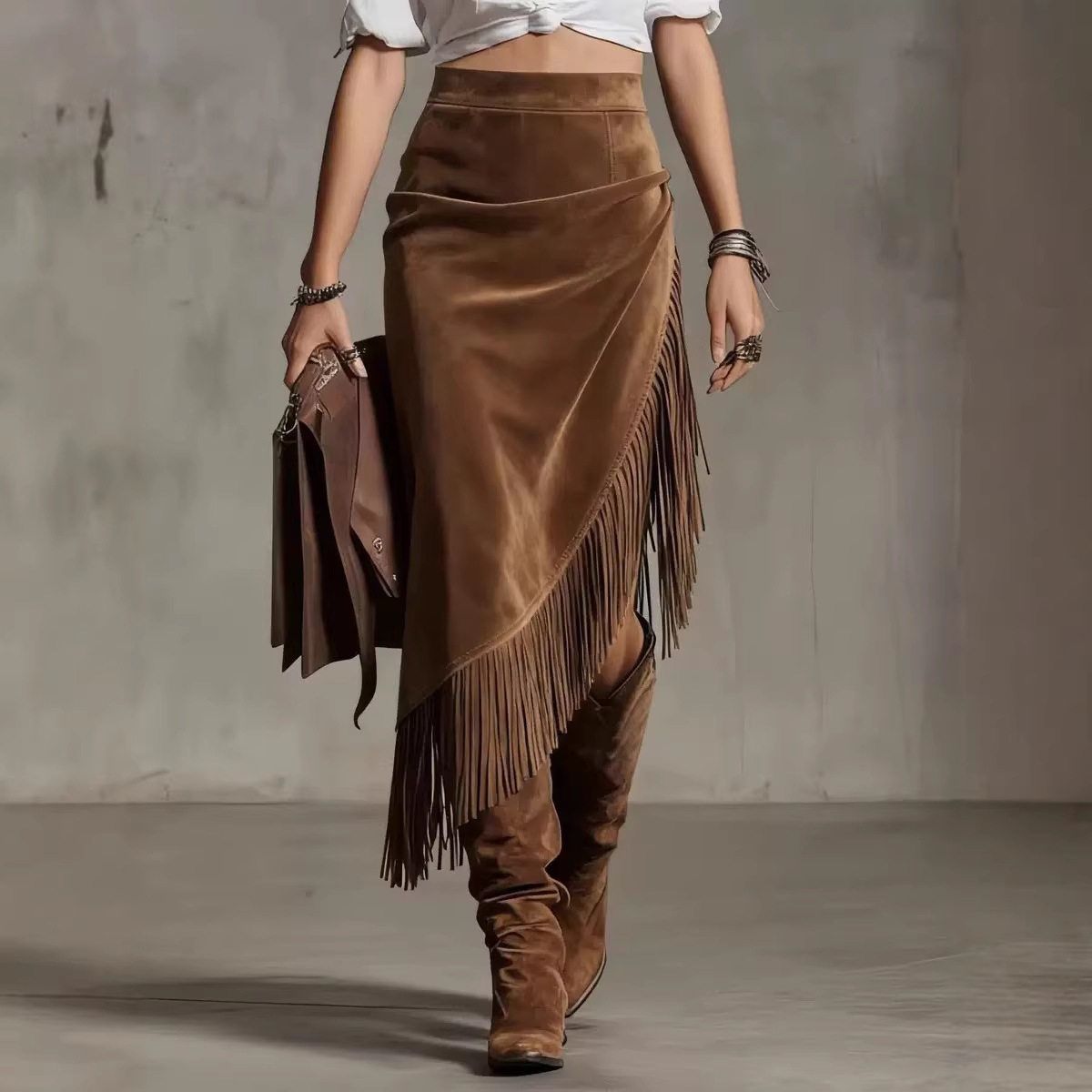 2026亚马逊欧美跨境欧码复古西部风格不规则设计麂皮裙纯色半身裙