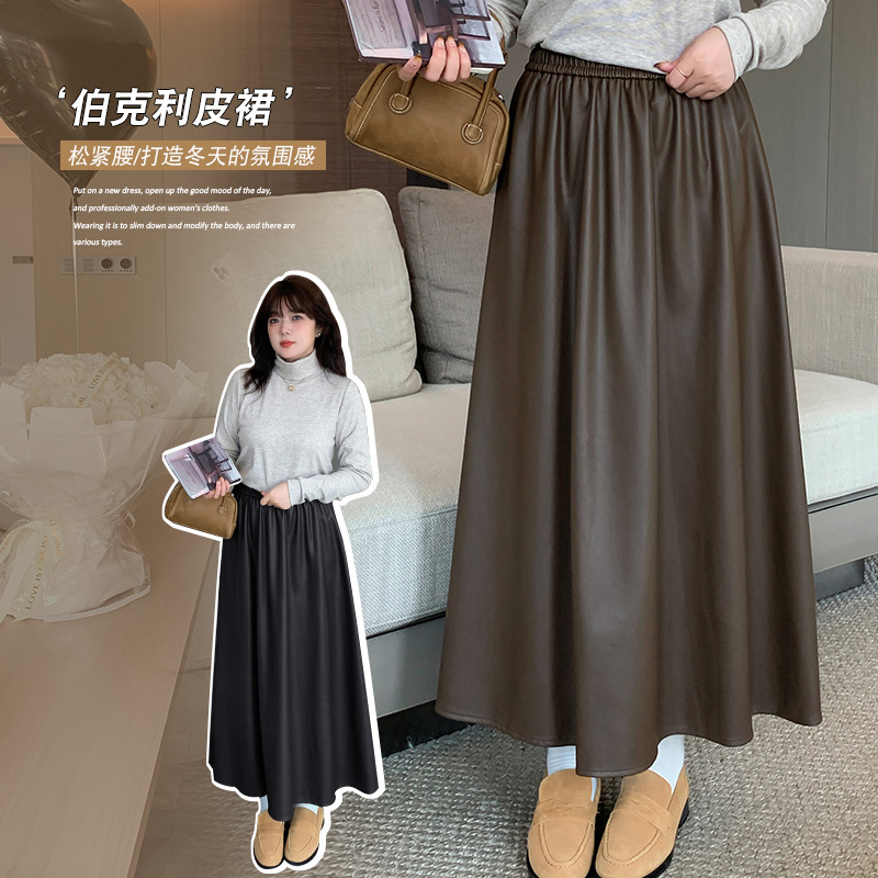 W1096 pakaian wanita trendi, pakaian wanita baru musim gugur, rok kulit panjang setengah panjang, suasana pinggang elastis, pelangsing pinggang tinggi, pakaian anak perempuan
