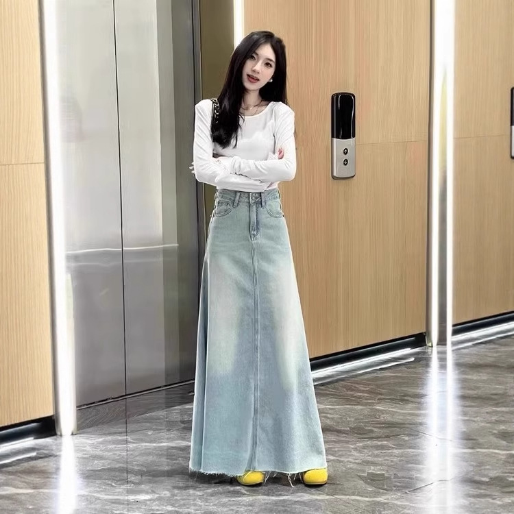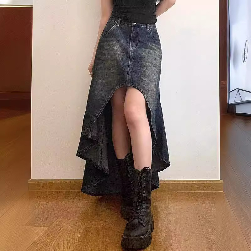 Real shot rok denim tidak beraturan, rok denim pas badan musim panas baru, rok panjang setengah, rok a-line serbaguna warna biru untuk pelajar