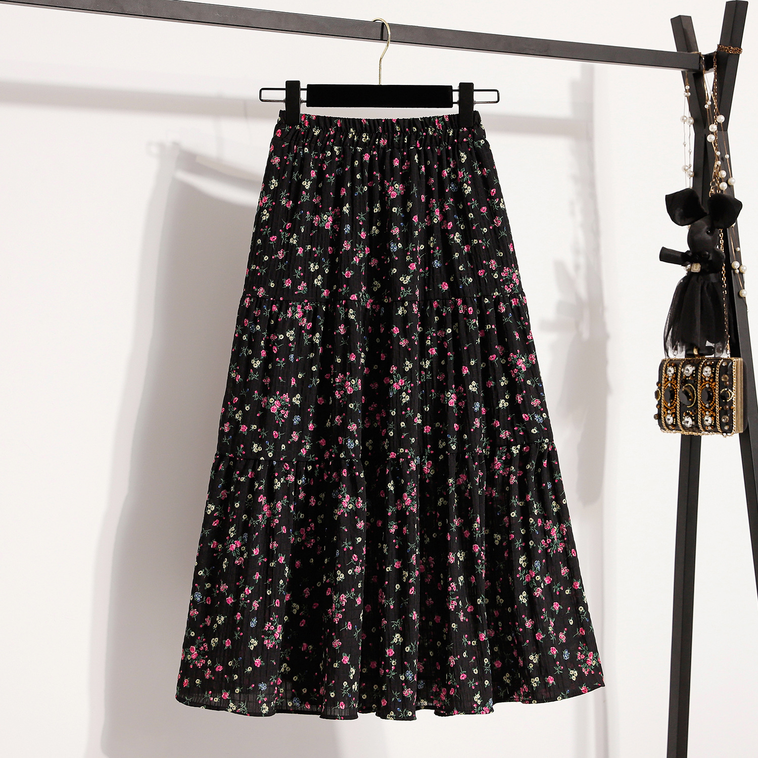 Rok Setengah Badan Bunga Hitam Ukuran Besar Rok A-line Terlihat Langsing Menutupi Perut Model Baru Musim Panas 2025 Rok Panjang Dipakai untuk Liburan di Pantai