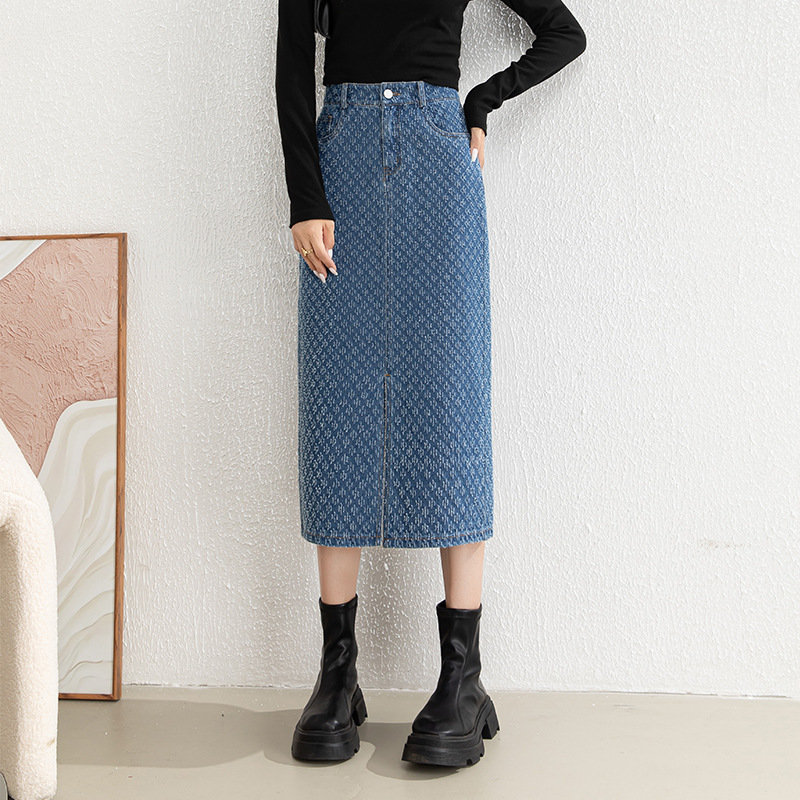 Dicuci jacquard Denim setengah panjang a-line rok untuk wanita 2024 musim panas gaya Korea robek ukuran besar dipotong rok split 8015