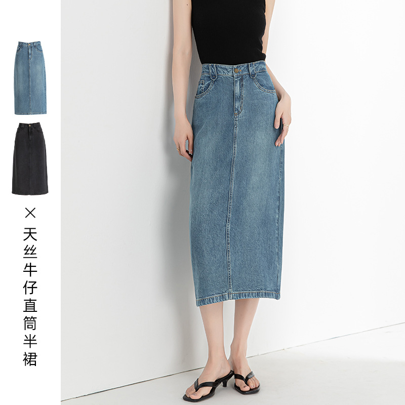 Rok Denim Tencel Ukuran Besar Xingge untuk Wanita, Model Tipis Musim Panas 2025, Menyamarkan Perut, Meniruskan, Berbelah, Bodycon, Rok Panjang Sedang.