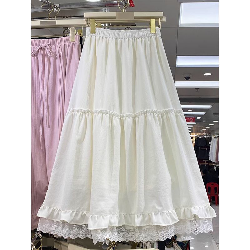 Rok Setengah Badan Renda Sambungan Warna Putih Rok Payung Instagram Kue A-Line Pinggang Tinggi Ketat Tipe Panjang Sedang Model Baru Musim Panas 2025