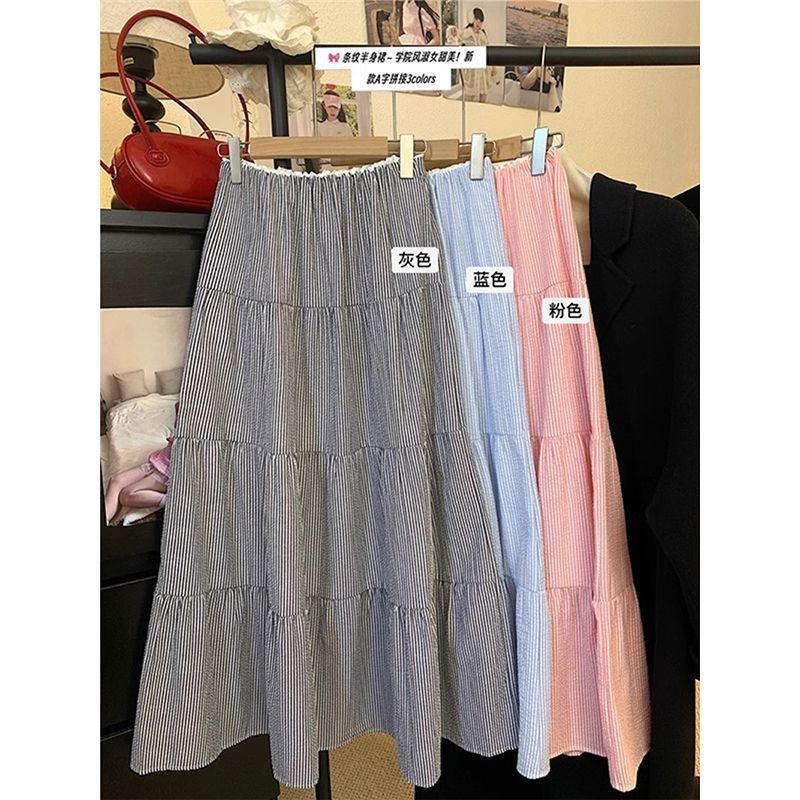 Rok Setengah Badan Model Sambungan Garis Vertikal Tipis Modis Rok A-Line Pinggang Tinggi Versi Korea Model Tipis Musim Panas Wanita Rok Kue Model Panjang Sedang