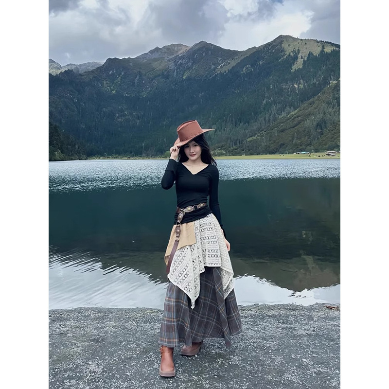 不规则拼接裙子半身裙女秋冬森系复古高腰大摆长裙A字裙格子伞裙